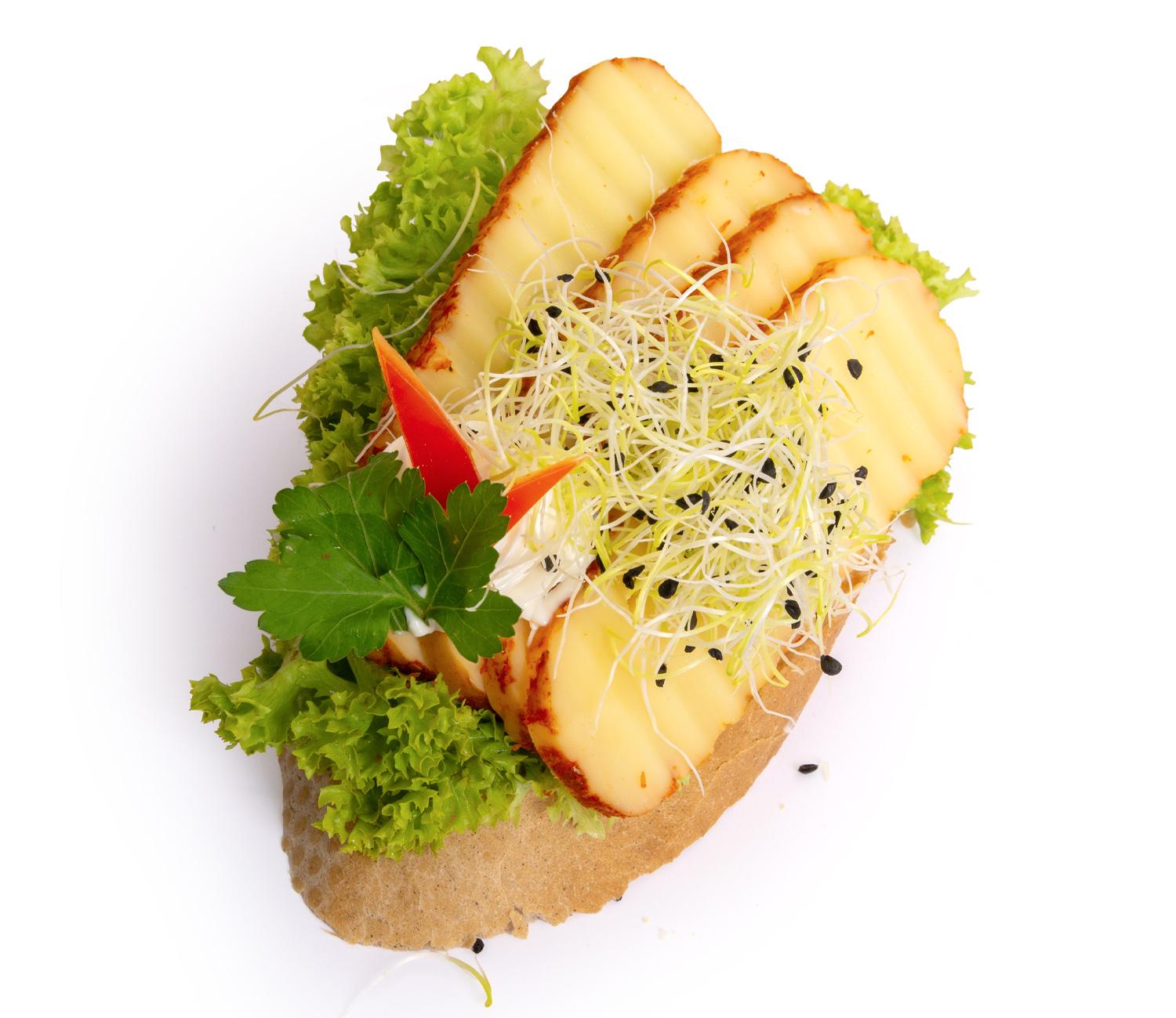 Veka cereální, sýrový salát, ementál 45%, uzený ementál 45%, eidam s bazalkou 45%, niva, salát biondo, vlašský ořech, hrozen, majonéza, pažitka.