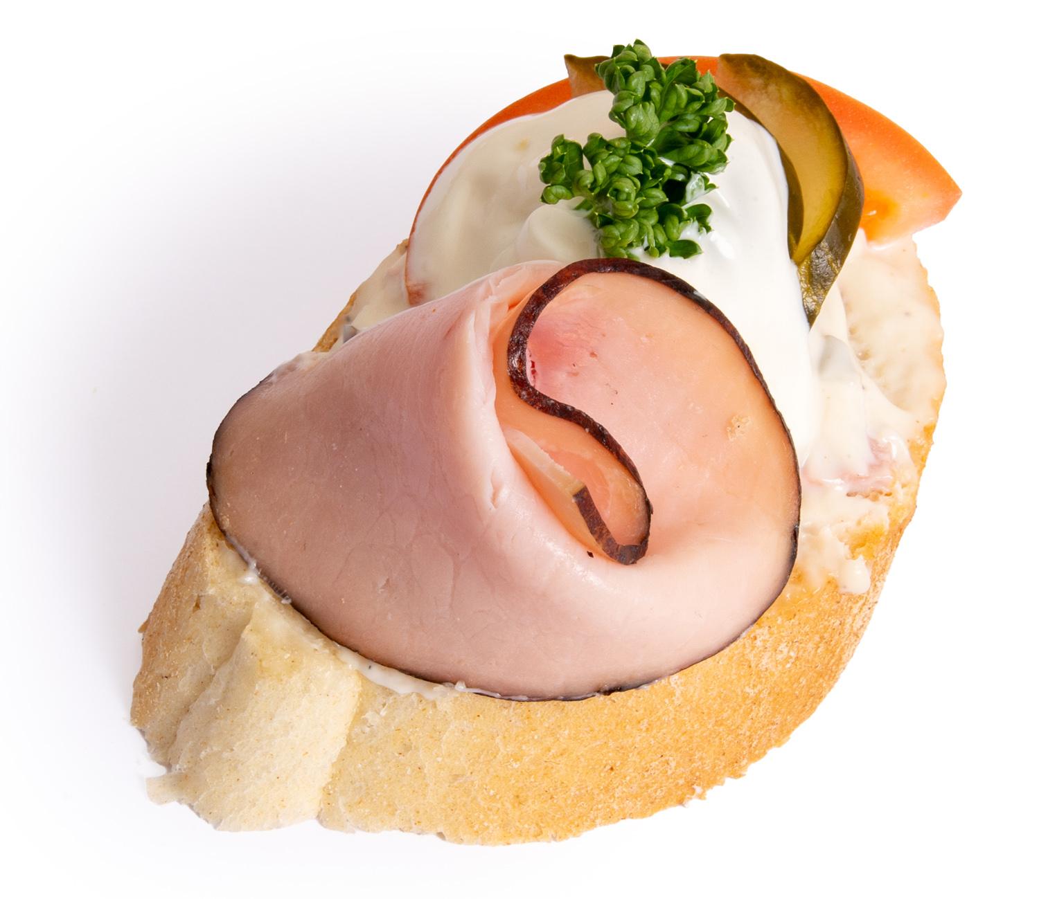 Bageta, máslo, šunka, sýr eidam, rajče, okurek sterilovaný, majonéza, petrželová nať.