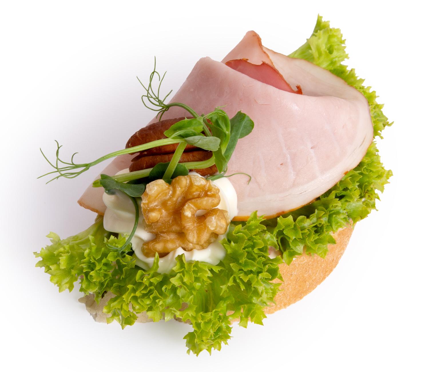Bageta, pařížský salát, venkovská šunka, salát biondo, vlašský ořech, pekanový ořech, majonéza, hráškový výhonek.