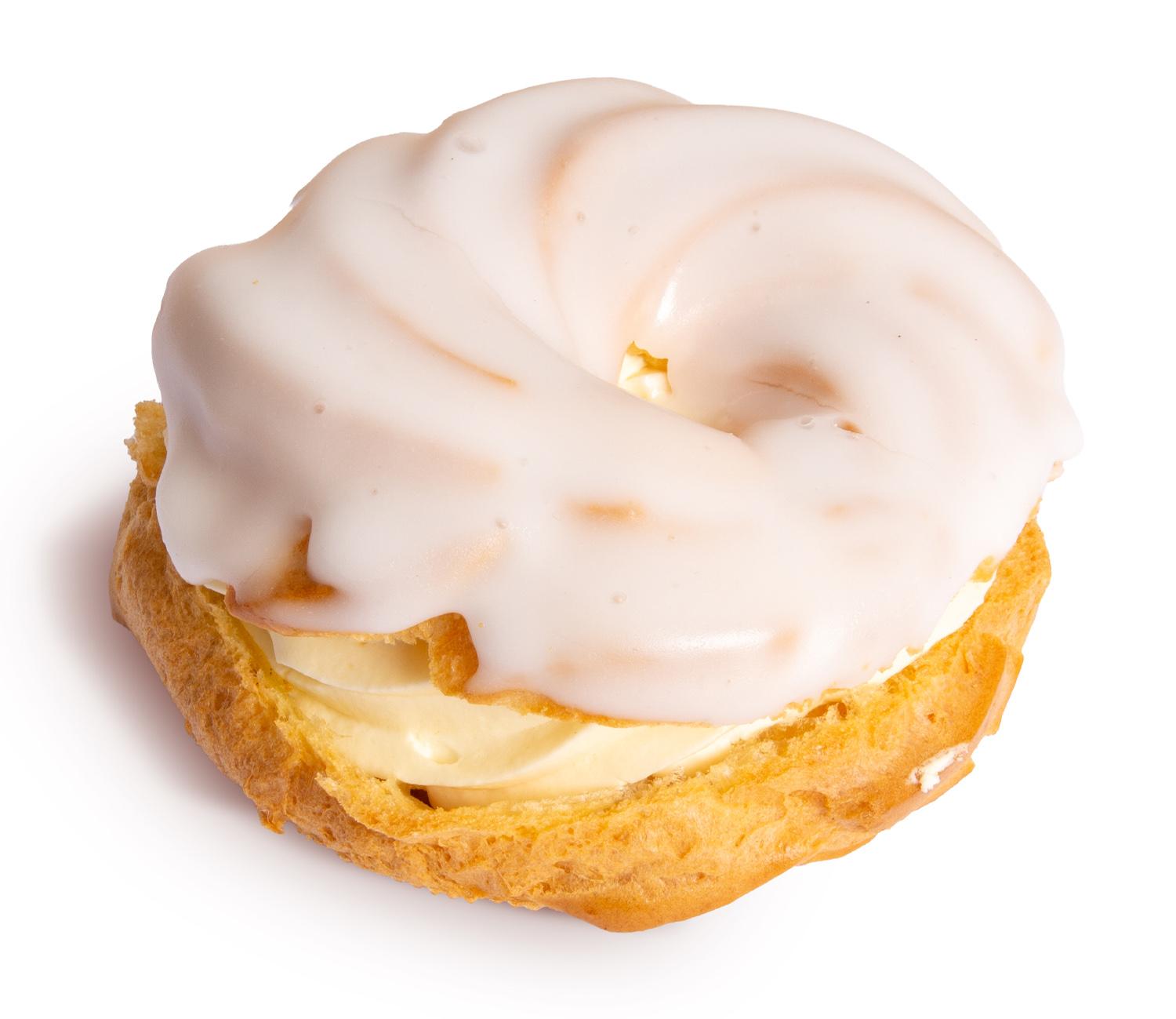 Odpalované těsto, cukrářský krém máslový s vanilkou, potaženo bílým fondánem.