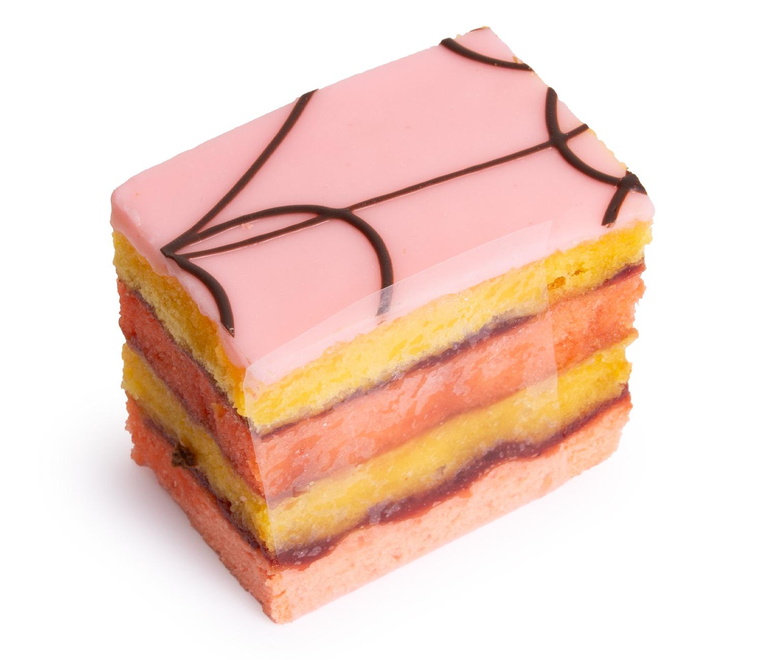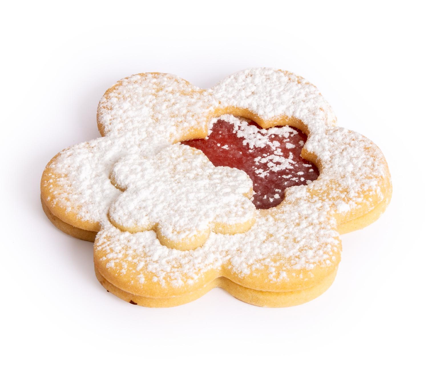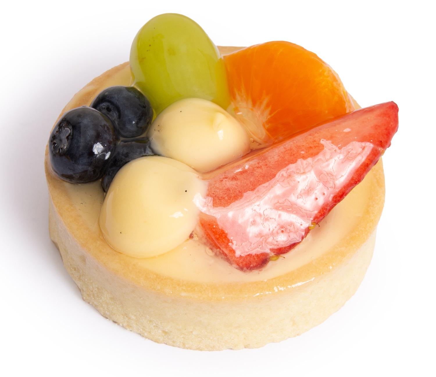 Těsto – linecké třené, krém – cukrářský máslový vanilkový, čerstvé ovoce, želatina.