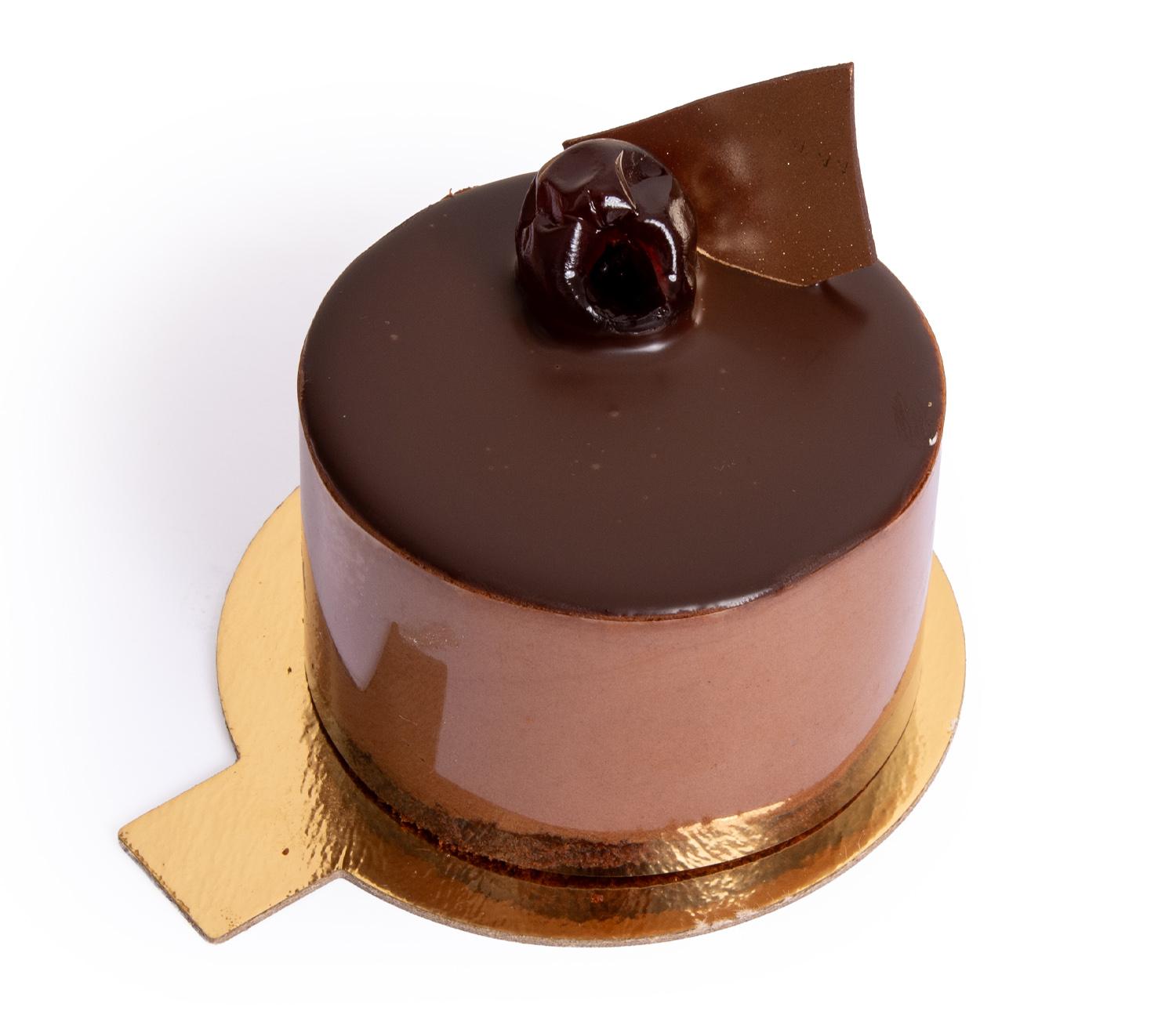 Plát kakaový, vklad višně naložené, krém mousse z Italské čokokolády Reno 64%. Dekorace Fabbri nakládaná višeň.